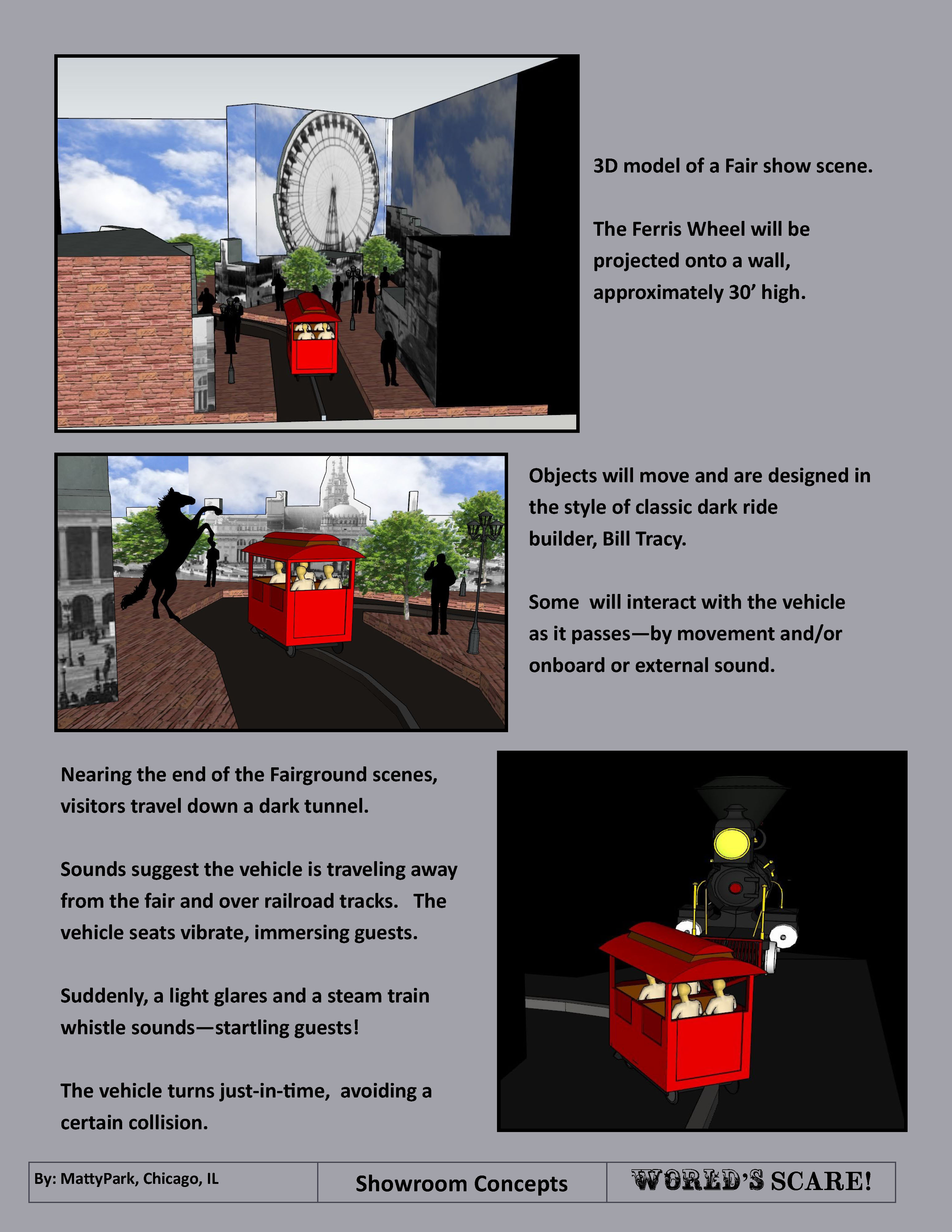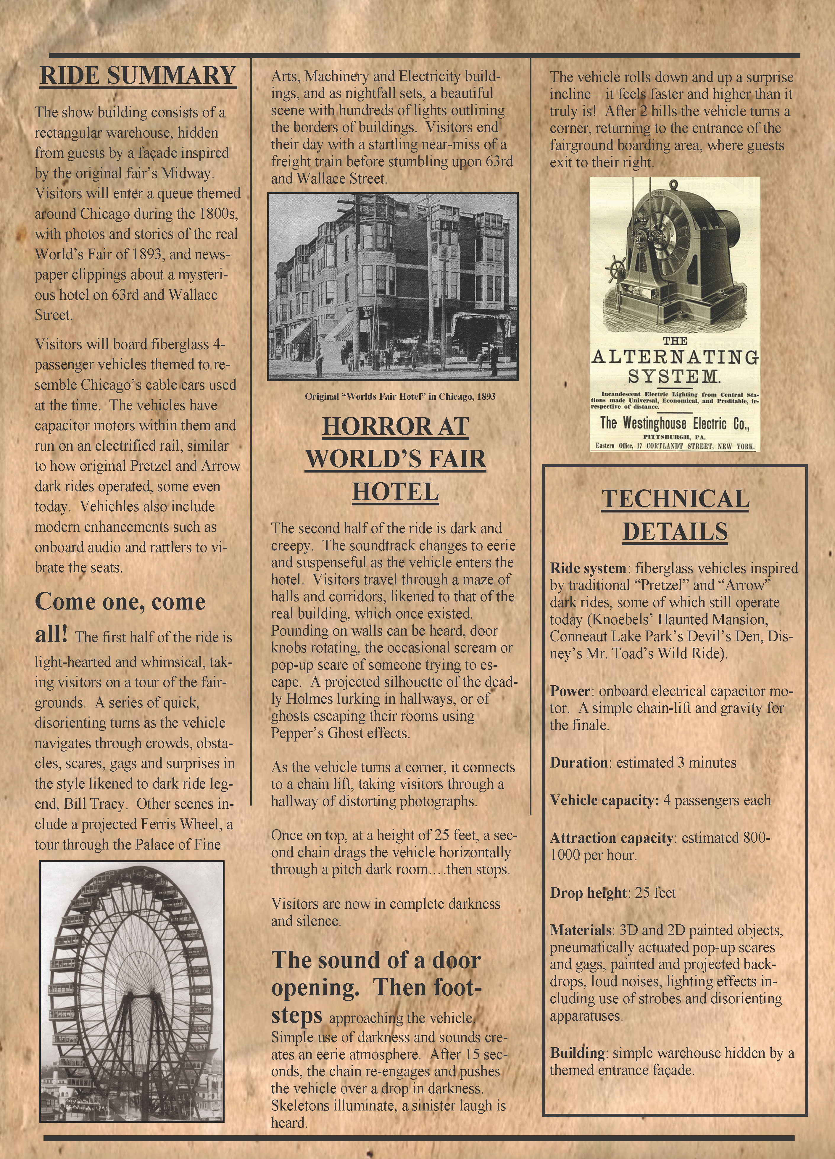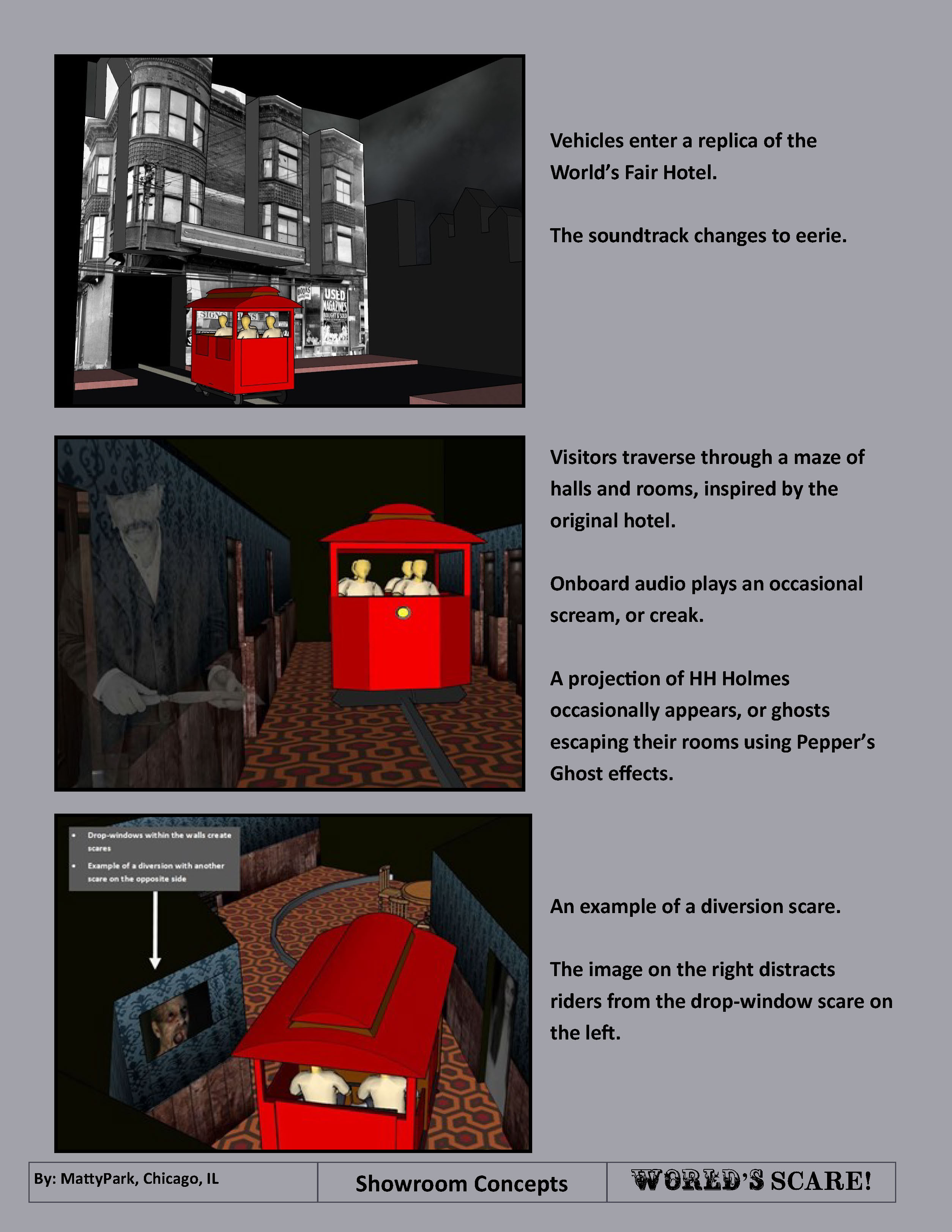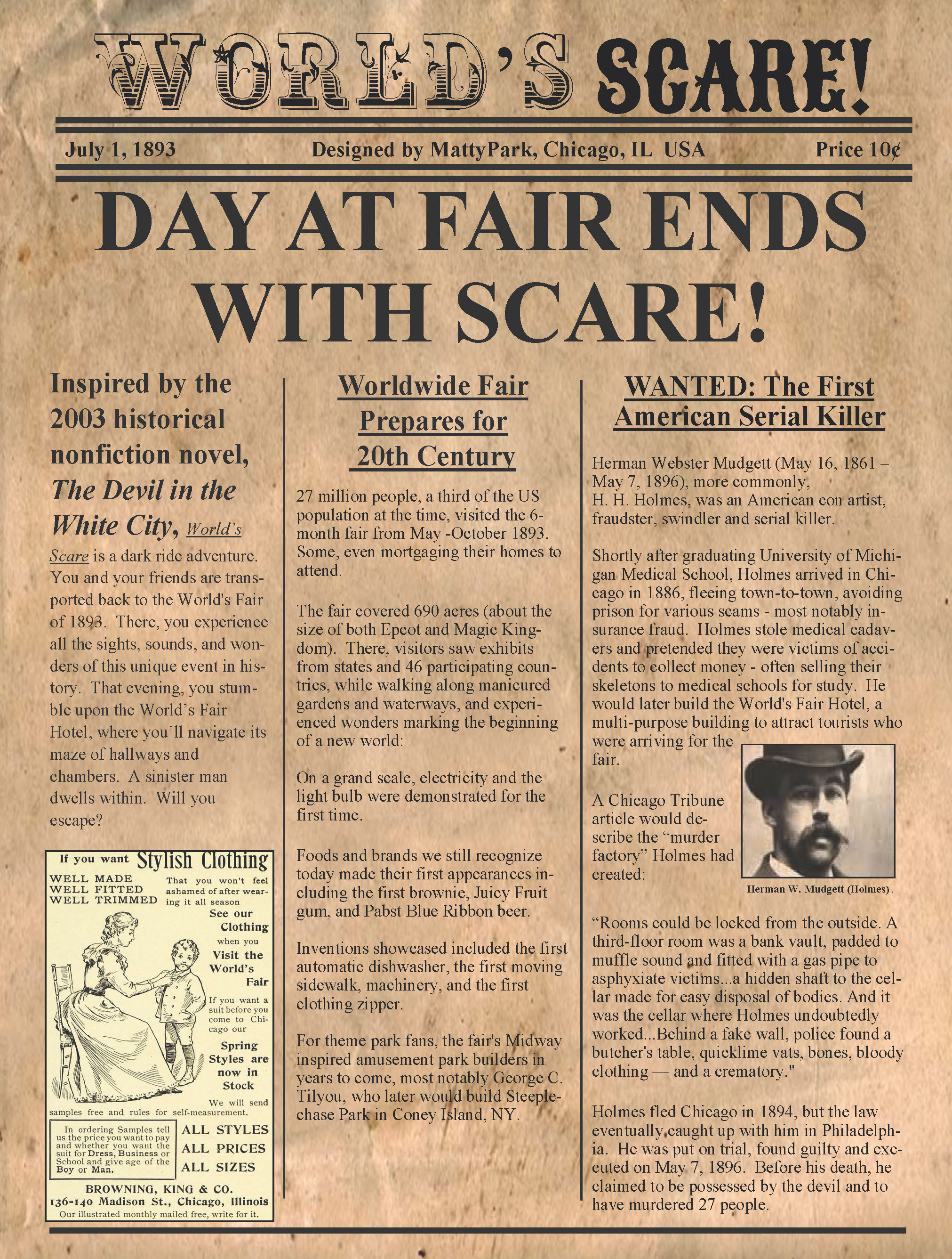 World's Scare is a classical dark-ride journey with a surprise ending, based upon the nonfiction book, The Devil in the White City by Erik Larson. The book is about the planning, construction, and excitement of the 1893 Worlds Fair in Chicago, as well as H.H. Holmes, who is believed to have been America's first serial killer.