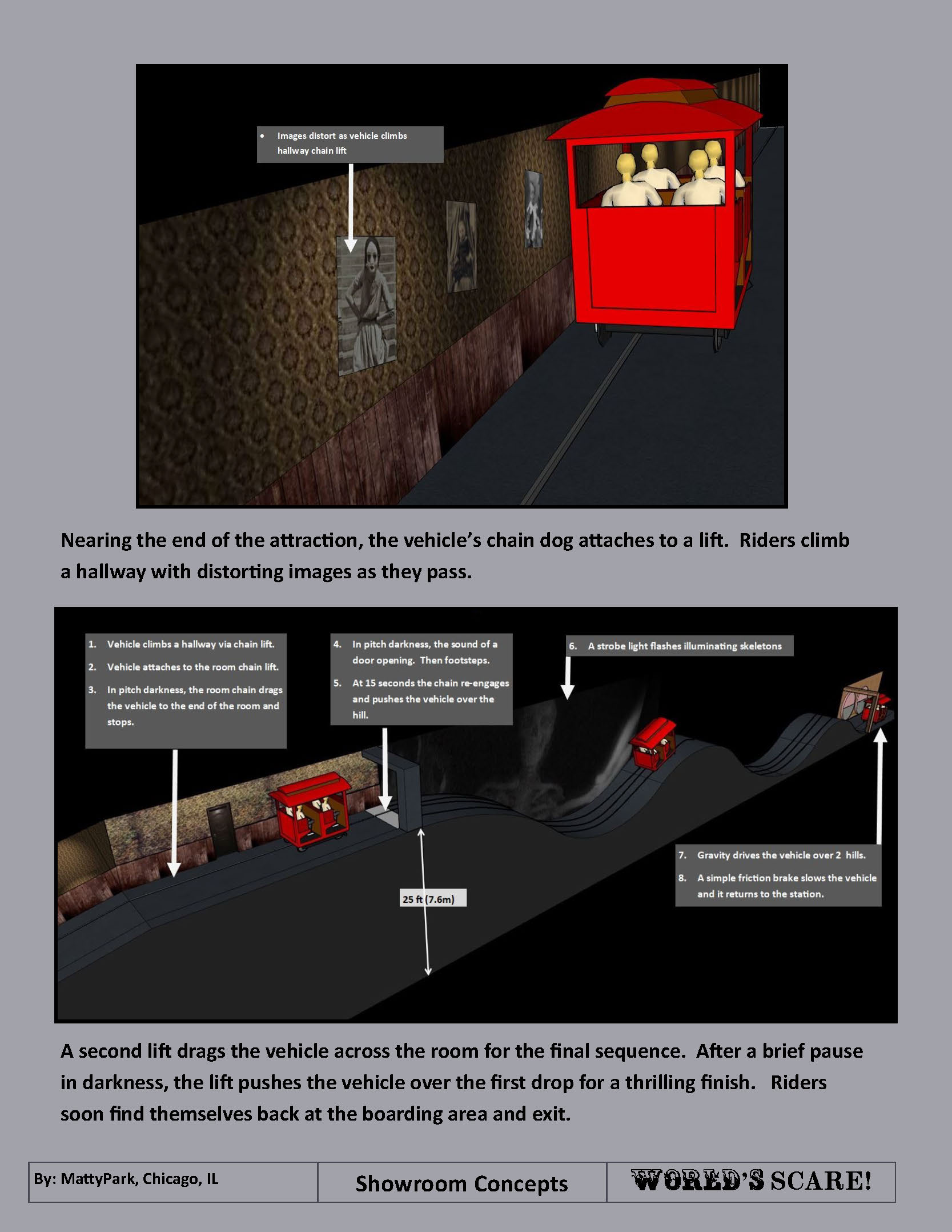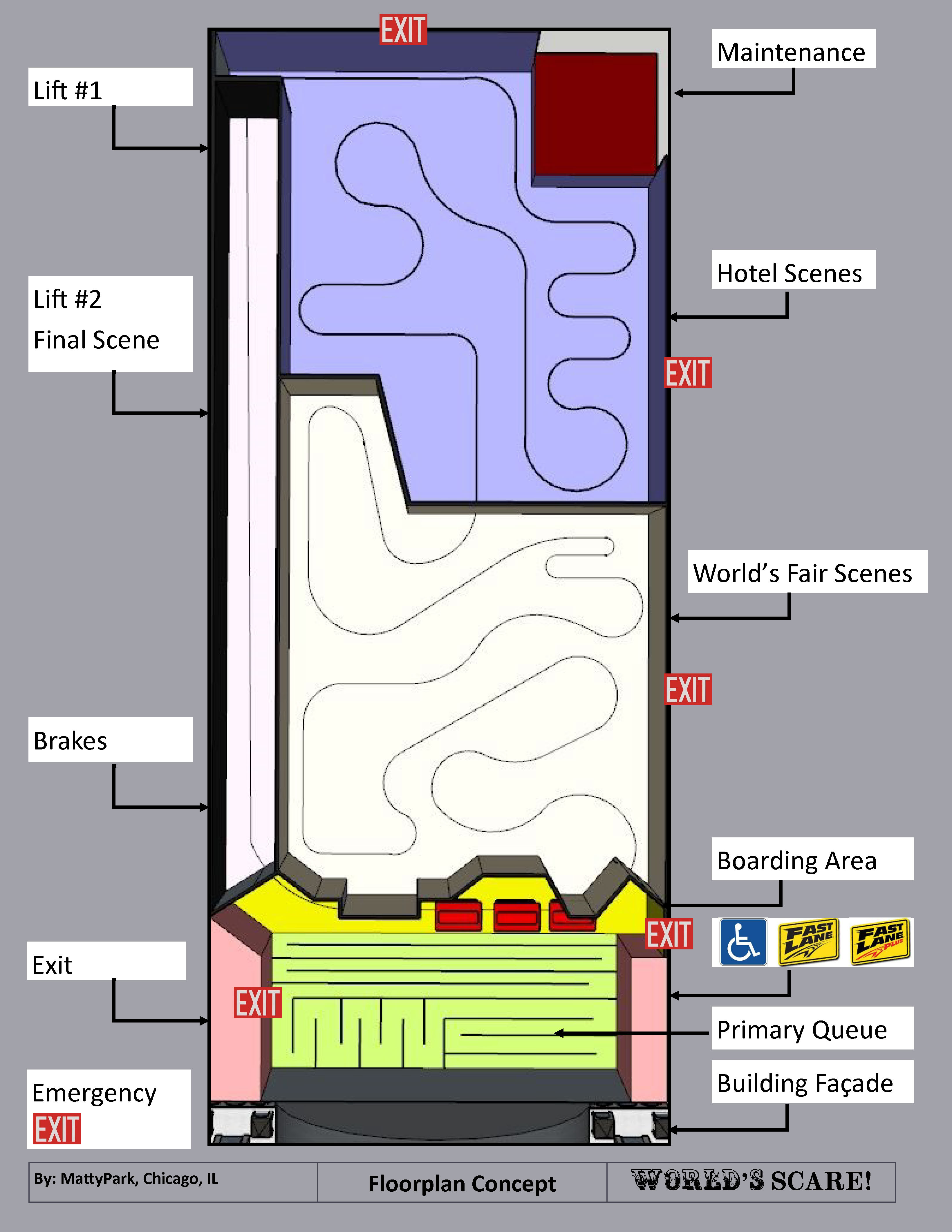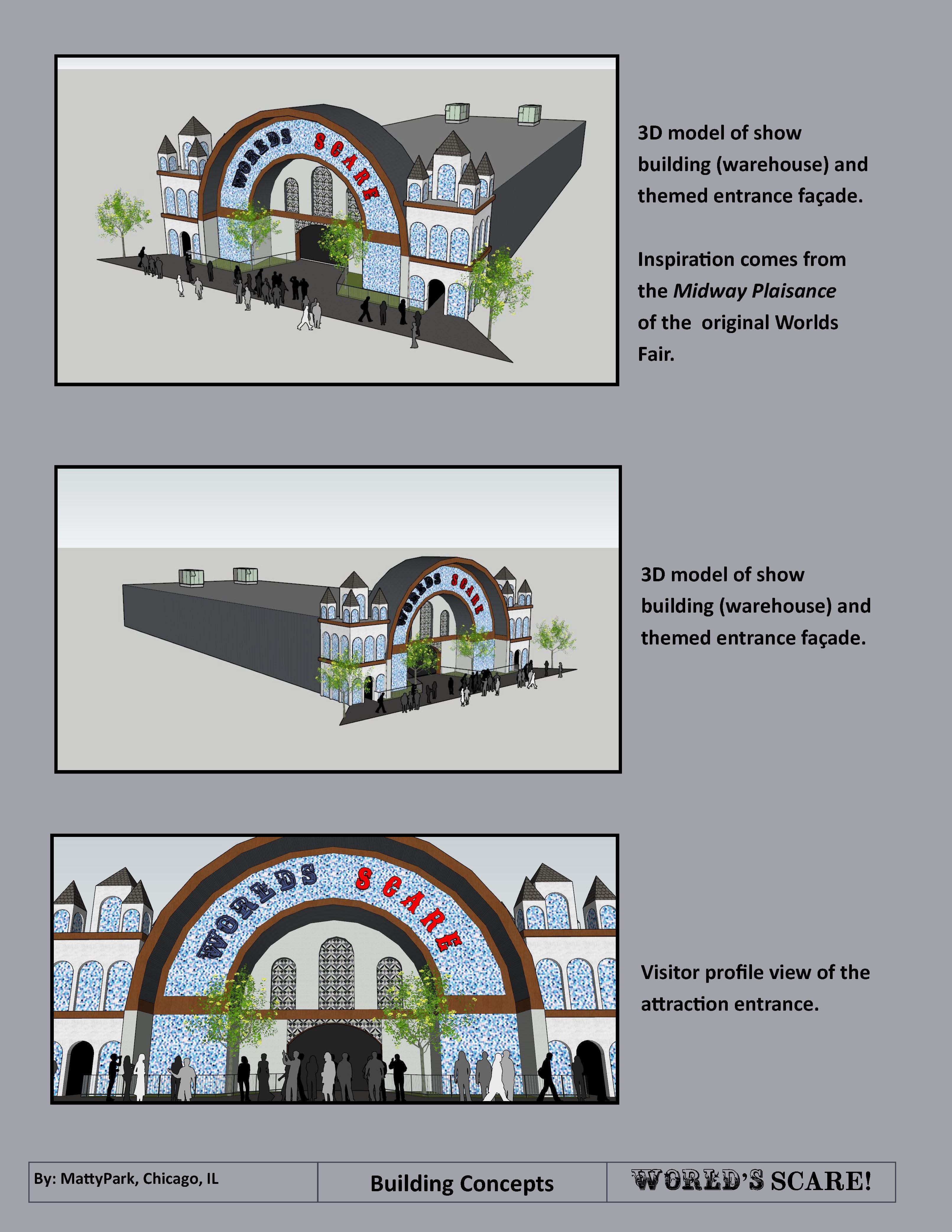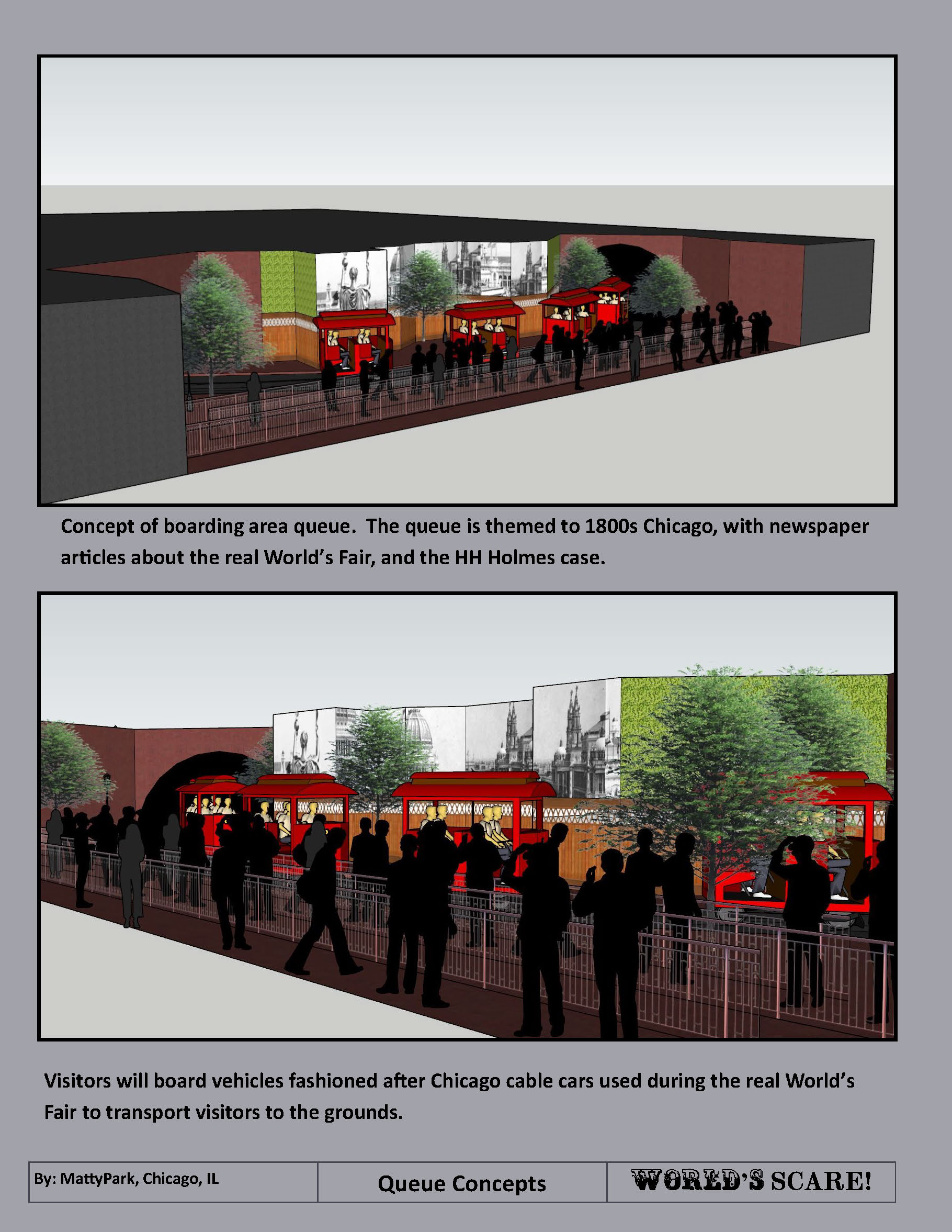World's Scare is a classical dark-ride journey with a surprise ending, based upon the nonfiction book, The Devil in the White City by Erik Larson. The book is about the planning, construction, and excitement of the 1893 Worlds Fair in Chicago, as well as H.H. Holmes, who is believed to have been America's first serial killer.